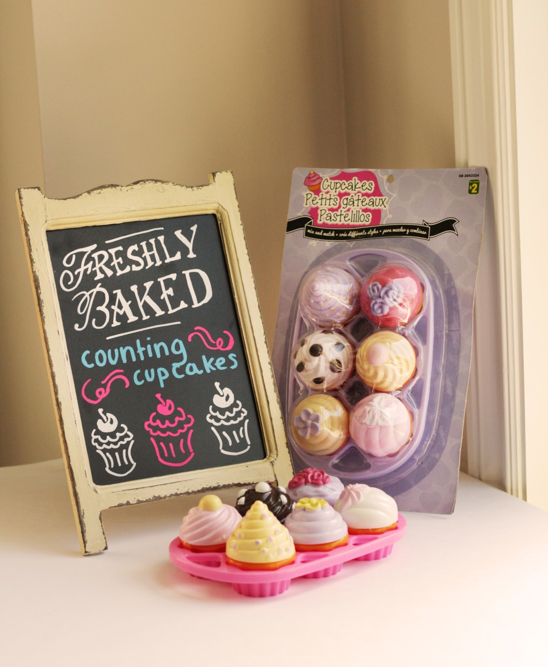 Teach your kids to count with these cute and colourful cupcakes! I’m always looking for ways to improve upon the toys I find, and below I’ll show you how to make your very own counting cupcakes using items that can be found in any dollar store.